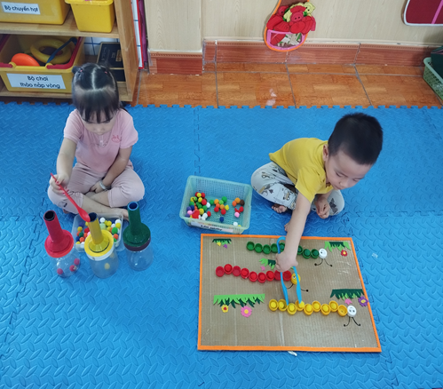 Với độ tuổi 24- 36 tháng, trẻ tham gia vào 4 góc chơi ở lớp như: Góc thao tác vai trẻ bắt chước giả bộ các trò chơi: Nấu ăn, bế em,cho em ăn, ru em ngủ…). Góc chơi vận động động (trẻ chơi kéo xe, thả bóng-bi, câu cá, tung bóng, một số trò chơi phát triển vận động tinh). Góc hoạt động với đồ vật (trẻ chơi lồng hộp, tìm bóng, phân biệt màu, so hình, xem tranh ảnh….). Góc làm quen với nghệ thuật nghệ thuật (Xem tranh ảnh, tô màu, nặn, xe dán…). Ở mỗi góc chơi trẻ được học những kiến thức, kỹ năng khác nhau và quan trọng hơn cả là trẻ có cơ hội được thể hiện mình và biết phối hợp cùng bạn khi tham gia các hoạt động.