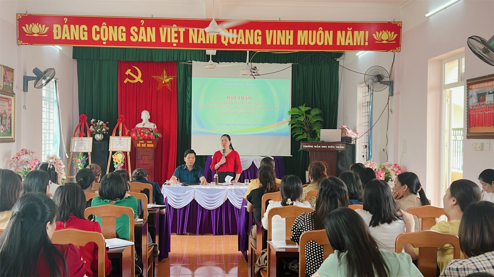 Thực hiện nhiệm vụ năm học, sáng ngày 24/4/2024 PGD&ĐT huyện Tiên Lãng tổ chức Hội thảo Sơ kết 03 năm thực hiện Chuyên đề "Xây dựng trường mầm non lấy trẻ làm trung tâm" giai đoạn 2021 - 2025 và Hội nghị giao ban công tác tháng 5 năm 2024, địa điểm tại trường Mầm non Tiên Thắng gồm các nội dung: