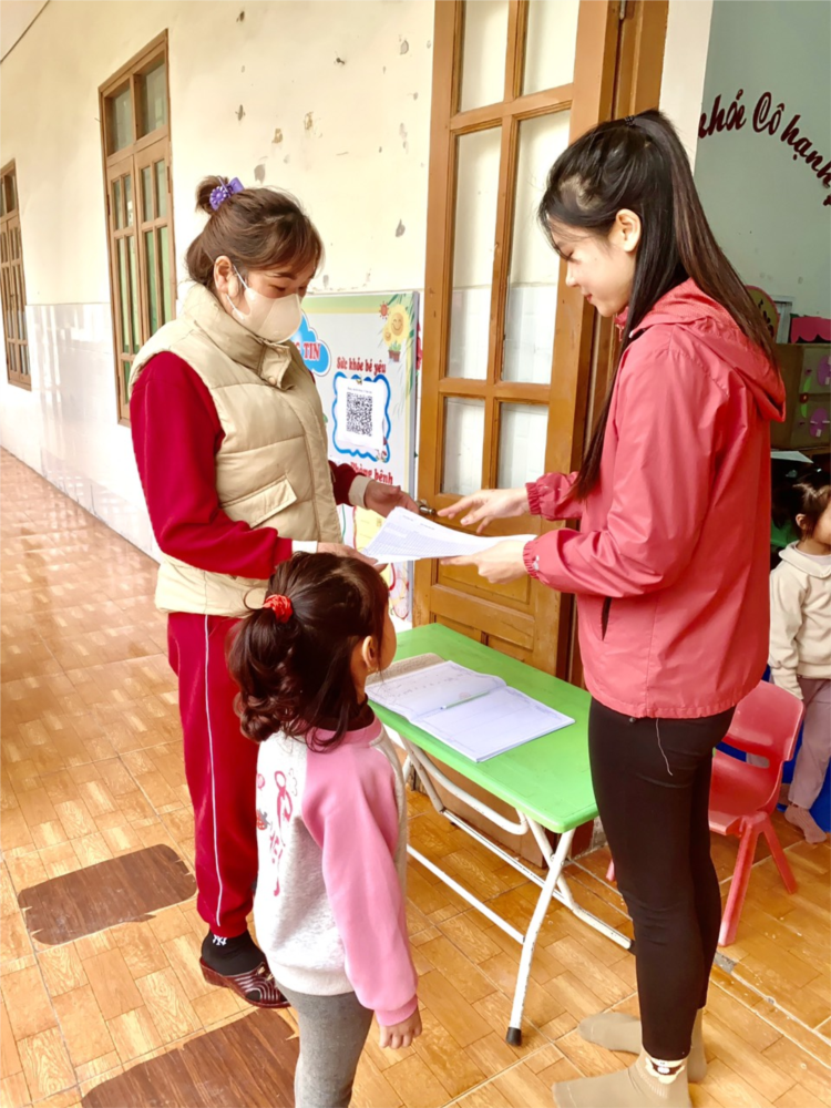 Đây cũng là điều kiện thuận lợi nhất để cô giáo trao đổi với phụ huynh những kiến thức cơ bản về công tác chăm sóc, nuôi dưỡng trẻ nhằm giúp trẻ phát triển toàn diện về thể chất lẫn tinh thần. Đặc biệt, giáo viên và phụ huynh luôn phối hợp làm tốt công tác theo dõi sức khỏe các con khi tới lớp và trước khi ra về, thực hiện nghiêm túc công tác ký sổ theo dõi, rèn trẻ 1 số kỹ năng tự phục vụ như: cất balo, cất dép, sát khuẩn nhanh, kỹ năng chào hỏi.